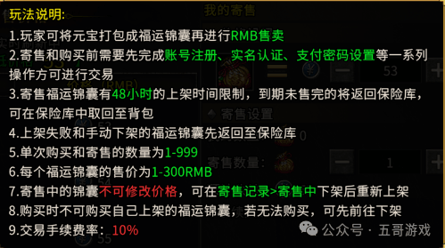 具体怎么操作呢?玩家可以将打到的元宝打包成福运锦囊上架到寄售中,有需要的玩家购入后,你就能获得RMB收益并提现!这一切都是在游戏中进行的!散人玩家再也不用担心找不到人回收了!