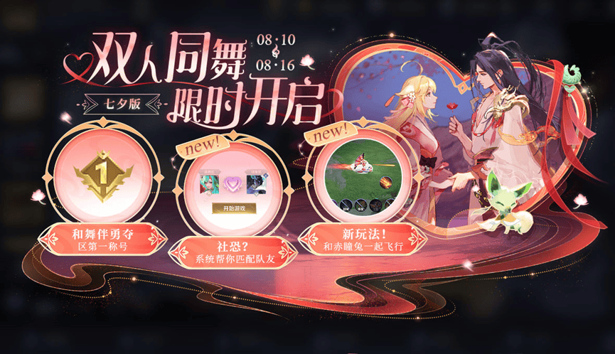双人同舞七夕版全新上线,这次可以直接单人匹配,有点关爱单身狗的意思。可以和陌生人共乘赤瞳兔,一起控制同个英雄,想想就觉得有点刺激,但希望大家放宽心态,别在游戏里吵起来了。