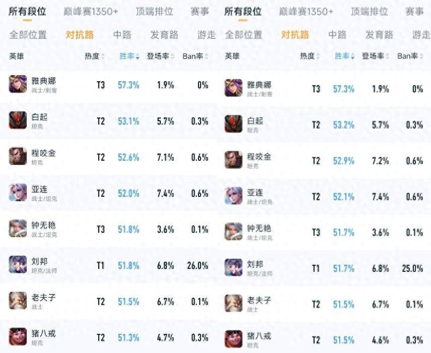 从下图中可以看出,大部分对抗路英雄的排位胜率并没有较大变化,变化最大的还是程咬金,其胜率已从52.6%上涨至52.9%,而钟无艳、刘邦、白起等英雄的胜率甚至还有略微下跌的情况。