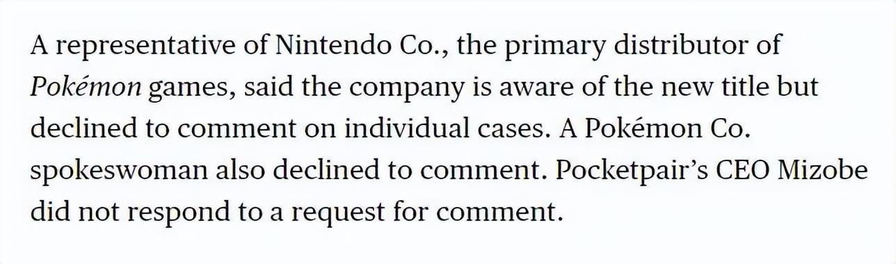 据彭博社报道,任天堂方面的人士表示,目前已经知晓了这款游戏的存在,不过公司拒绝就个别案例发表评论。而GAME FREAK的发言人同样表示拒绝置评。