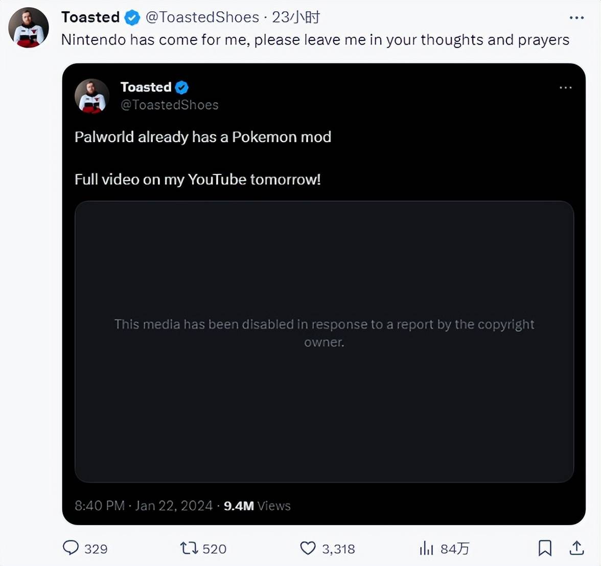 然而,事与愿违。预告的Mod视频发布不久就因为在推特上受到了版权方的举报而下架。ToastedShoes发推称:“任天堂来找我来了,快帮我祈祷!”