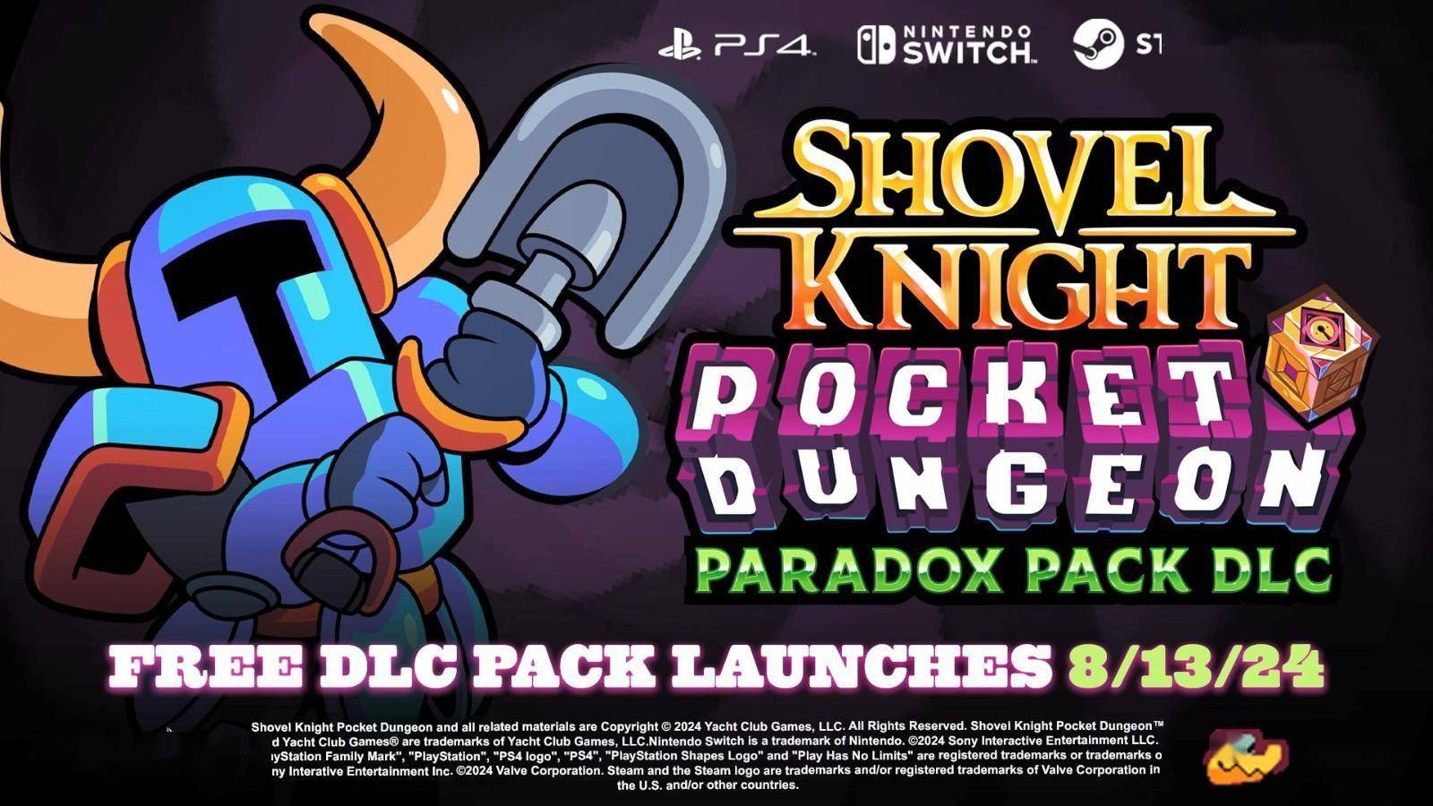 8月9日,《铲子骑士:口袋地牢》免费DLC“Paradox Pack”宣布将于8月13日正式上线,登陆PS4、Switch和Steam,包含了新可玩角色、Mod支持(仅限Steam)、小BOSS、强大的遗物、古怪的物品和帽子和更多秘密等全新内容。除此之外,官方还预告了《铲子骑士:口袋地牢》的第三个也是最后一个DLC目前正在开发中,将为游戏引入玩家期待已久的在线多人合作功能。