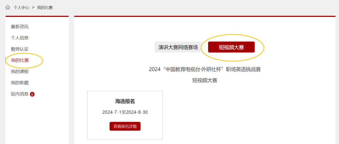 * 短视频大赛各阶段晋级信息可于“个人中心”-“我的比赛”-“短视频大赛”-“查看XX阶段结果”中查看。晋级结果发布后,选手将收到短信提示。
