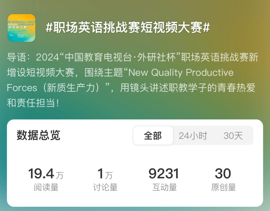 随着报名的开启,“职场英语挑战赛短视频大赛”微博话题也迎来了更多的关注和讨论,作为大赛参赛作品的指定发布渠道,每条作品发布微博的点赞数也将作为海选晋级的重要参考。欢迎大家为自己喜欢的参赛作品评论点赞!