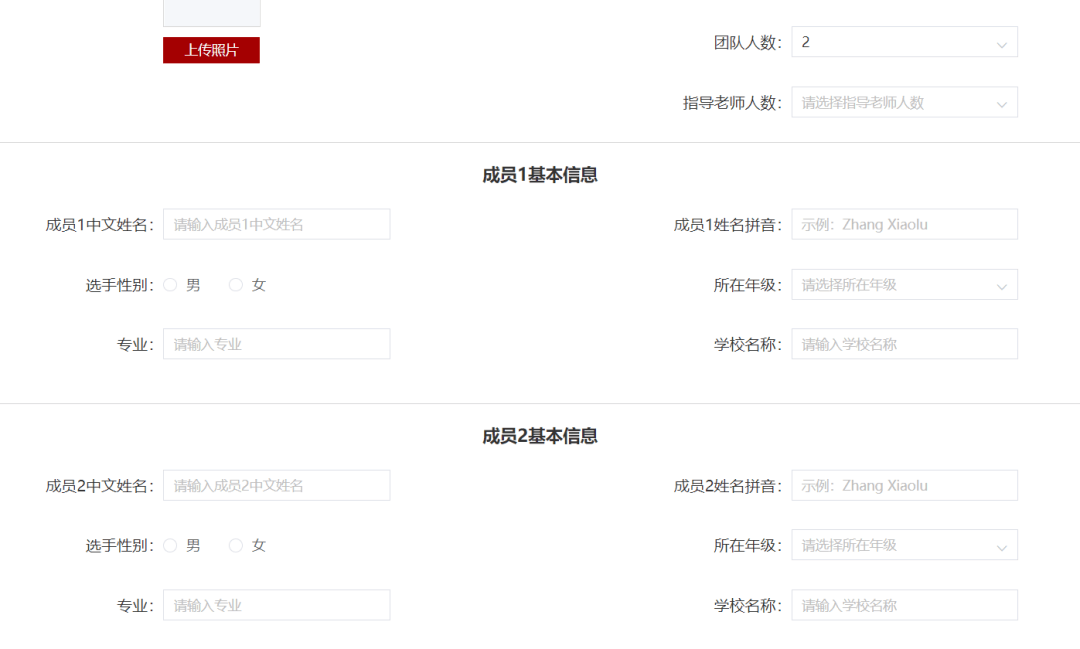 4.团队队长根据实际情况勾选团队人数(除队长),并填写团队成员信息。下图以团队人数2人为例(除队长)。