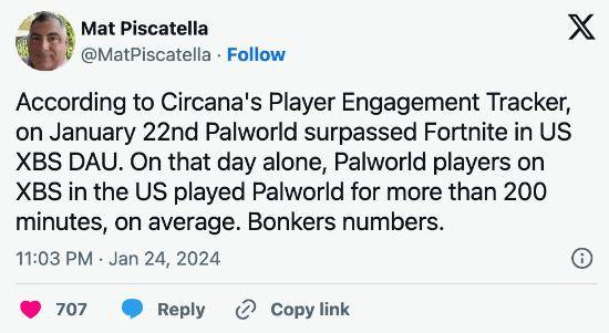 《幻兽帕鲁》的霸主地位仍在继续,昨日其销量已超过700万份,并成为Steam历史上同时在线人数第二高的游戏。据分析师兼Circana执行董事Mat Piscatella称,1月22日,这款游戏在XSX|S的日活用户超越了《堡垒之夜》,XSX|S玩家当日的游戏时间超过了200分钟。