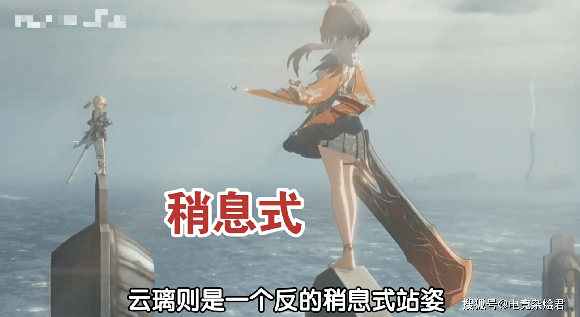 而云璃是一个反的稍息式站姿,双手提重剑,与彦卿是反过来的。对决中也确实是云璃先动,她起身的时候还用右手下压了剑柄,来调整进攻角度,将一把重剑舞得猎猎生威。