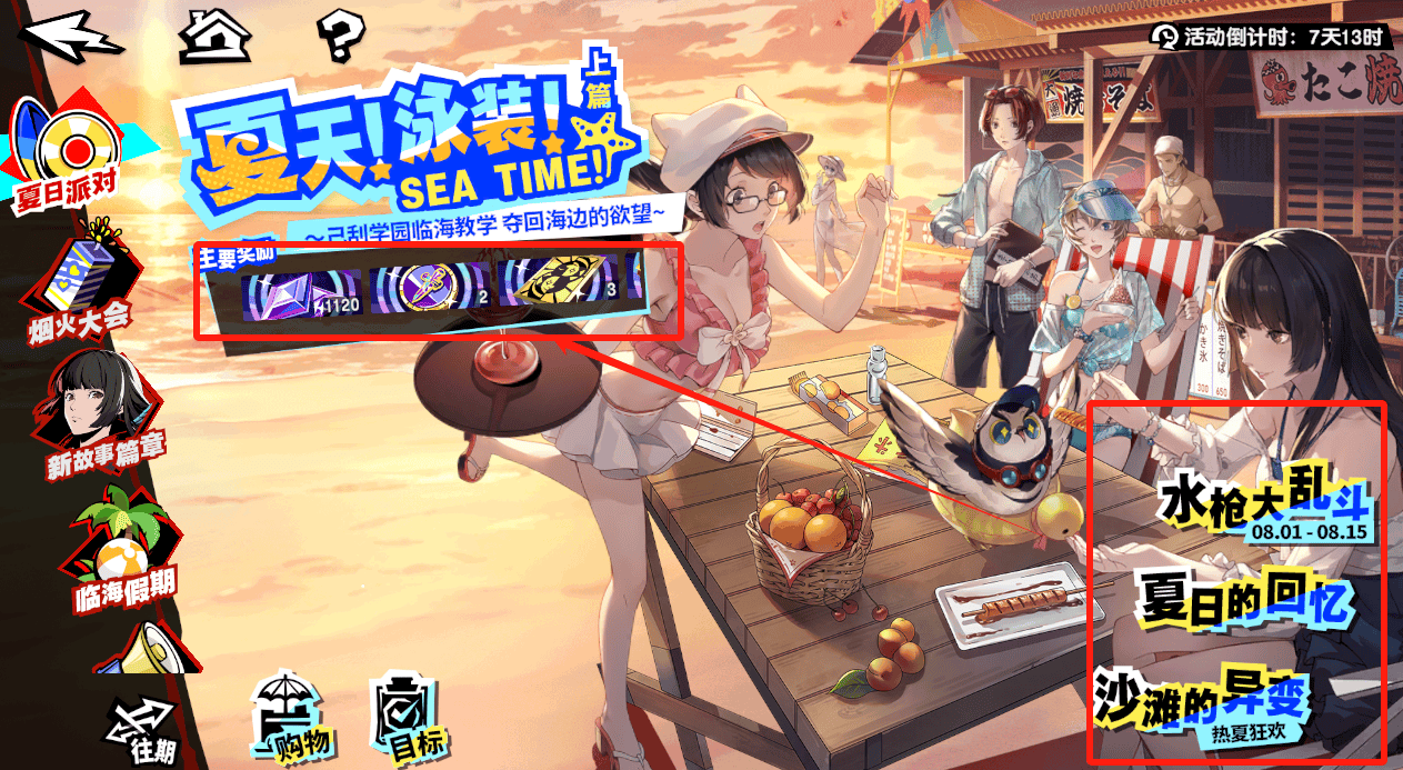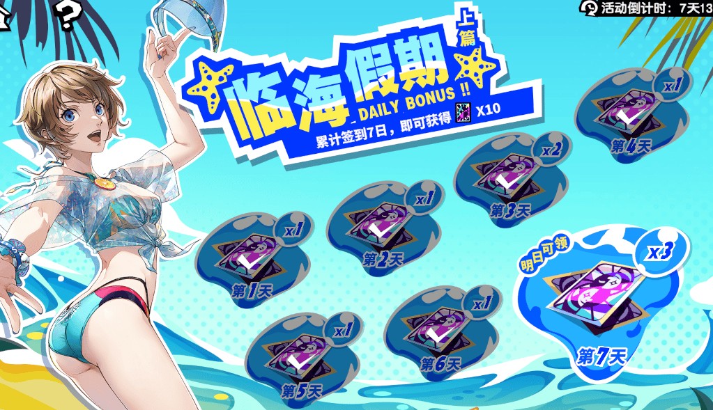 首先,在夏日派对中有3个限定活动:【水枪大乱斗】一共有17关挑战,只需要完成(第17关没有魂石和贝壳奖励)全部挑战目标,(每关)就可以拿到50个贝壳(商店代币)、20晶珀、3个尺玉弹和5000魂石;【夏日的回忆】中有7个角色泳装剧情,过完(单个角色)所有的剧情,可拿到(单角色)100晶珀+1张普池卡(因为现版本只开启了3个角色的专属剧情,所以只能拿到300晶珀+3张普池卡);而挑战副本【沙滩的异变】,每个关卡也能拿50晶珀和其他养成材料等奖励,并且达到对应的作战目标,还能领取额外的贝壳、尺玉弹和养成材料福利。算下来的话,可以拿到1120的晶珀、2张专武卡/7张普池卡和大量的养成材料……