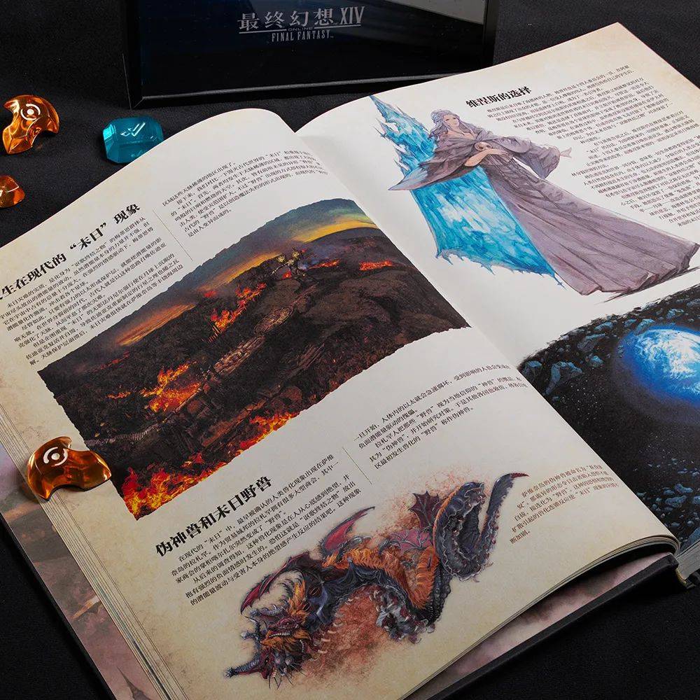 《艾欧泽亚百科全书Ⅲ》保留了以往大开本硬壳精装、做旧羊皮纸页面、烫金封面字体等设计,内容体量跟过去两部一致,主要介绍了“暗影之逆焰”和“晓月之终途”两个版本的新世界观、蛮族、职业、种族和特殊生命体等设定。