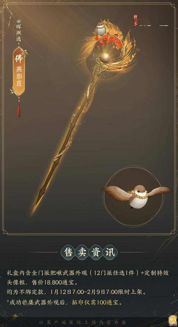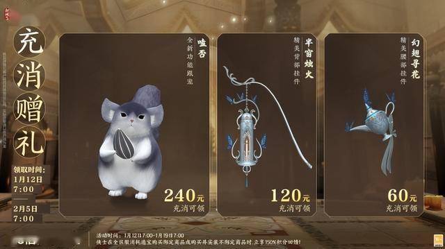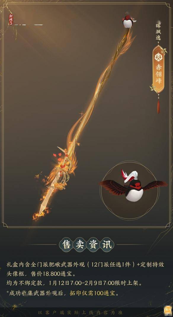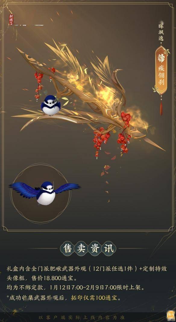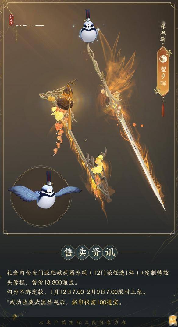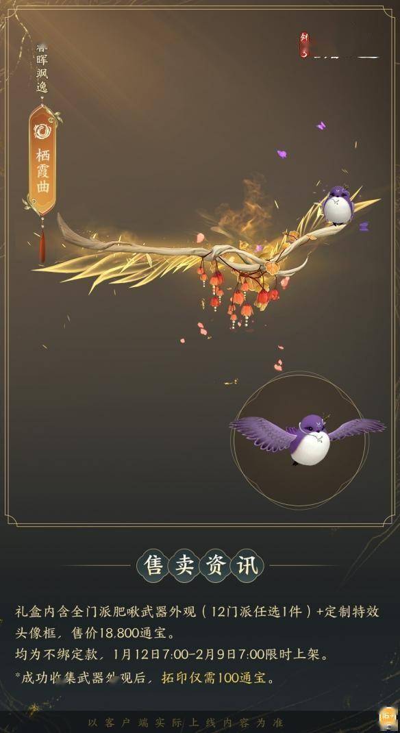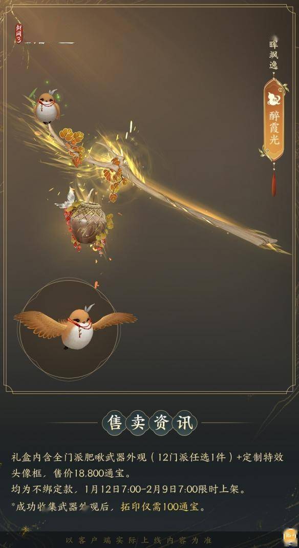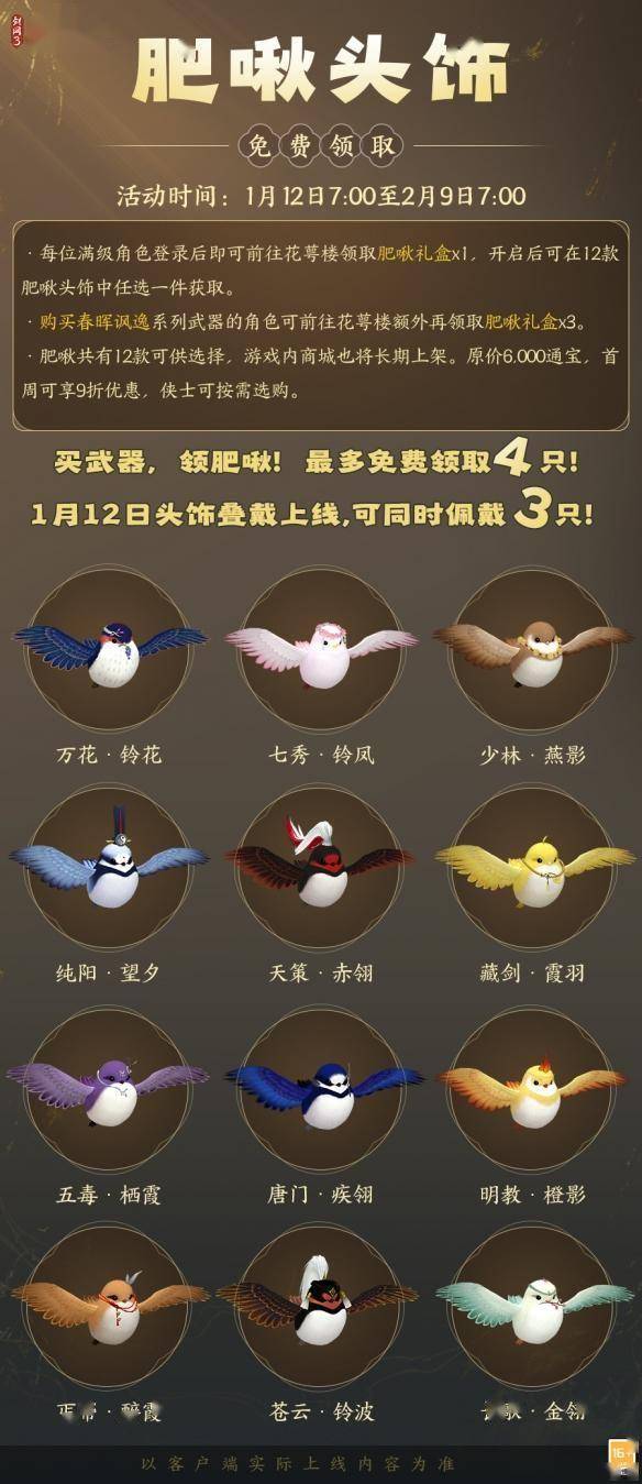 1月12日7:00-2月9日7:00,满级侠士可前往花萼楼领取肥啾任选礼盒x1,购买武器礼盒「群英论武·朝光」的侠士可额外领取肥啾任选礼盒x3!