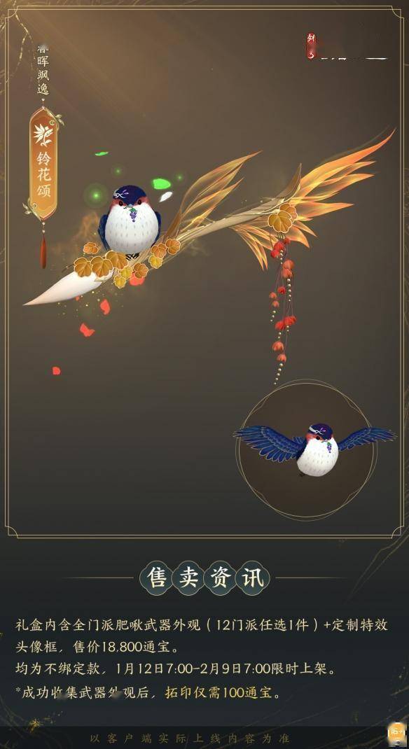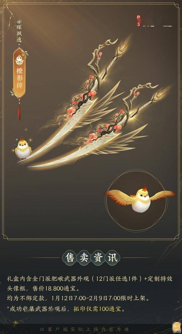 人歌小岁“啾”,花舞大唐春,全门派肥啾系列武器外观礼盒「群英论武·朝光」1月12日贺喜上新!礼盒内含「春晖飒逸」系列武器外观及定制特效头像框「像韵·辞花归秋」。