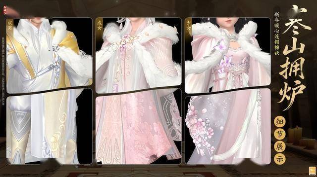 衣着以厚实的毛绒滚边搭配轻盈柔顺的绸缎,整体剪裁层次分明。配色上采用了冬日暖阳般的鹅黄、似初绽梅花般的粉嫩以及拟冰雪之纯的洁白,于寒冬中透出一股融融暖意。