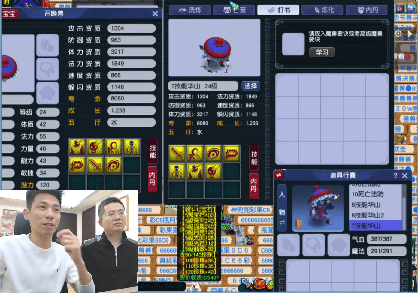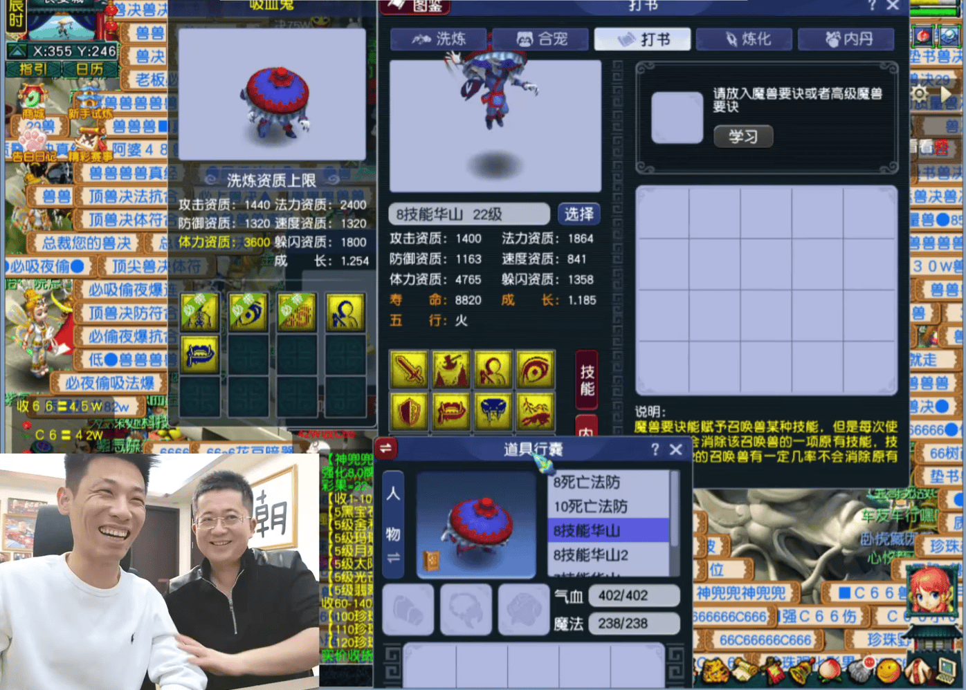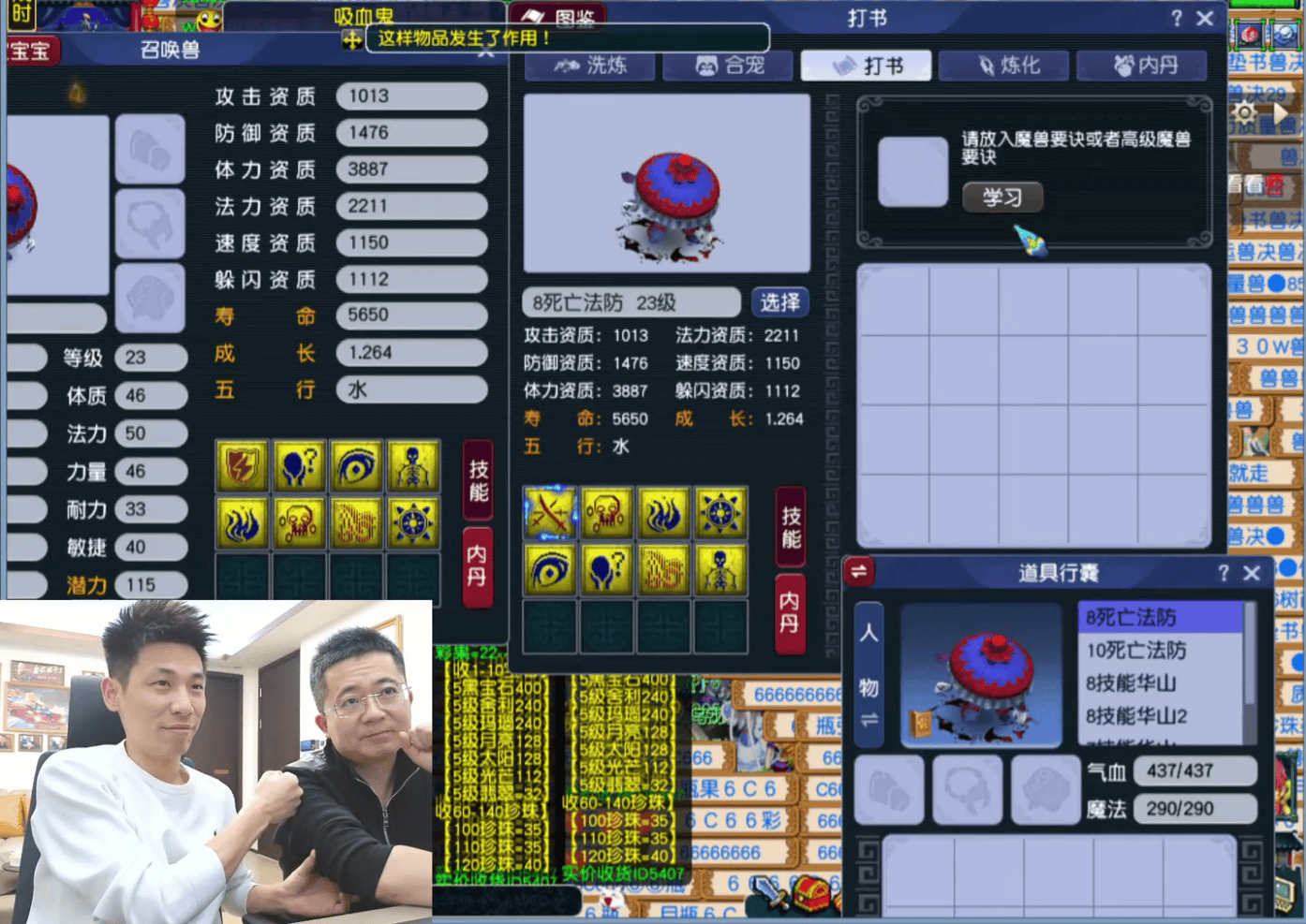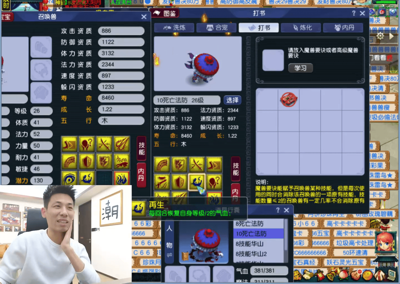 当晚他运气颇佳,炼妖结果令人满意,于是顺势为召唤兽打书。面对两只力劈吸血鬼,他再次展现强大运气,顺利打上多本红书,仅各留一个蓝色技能,其中一只8技能的丝毫不影响实战效果。