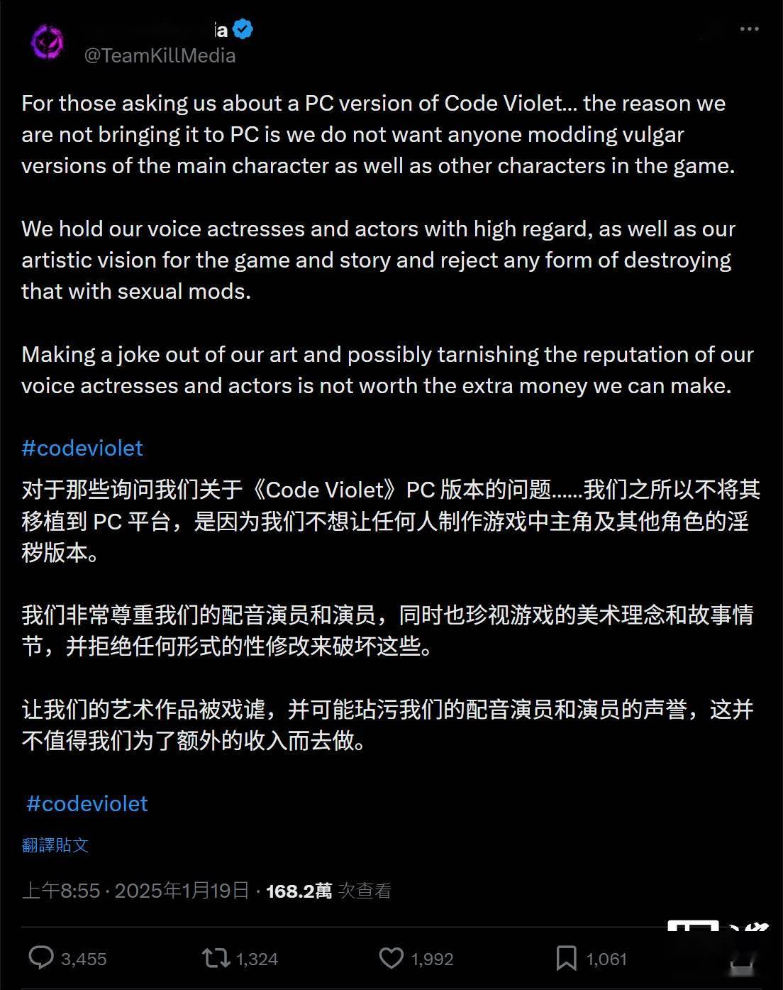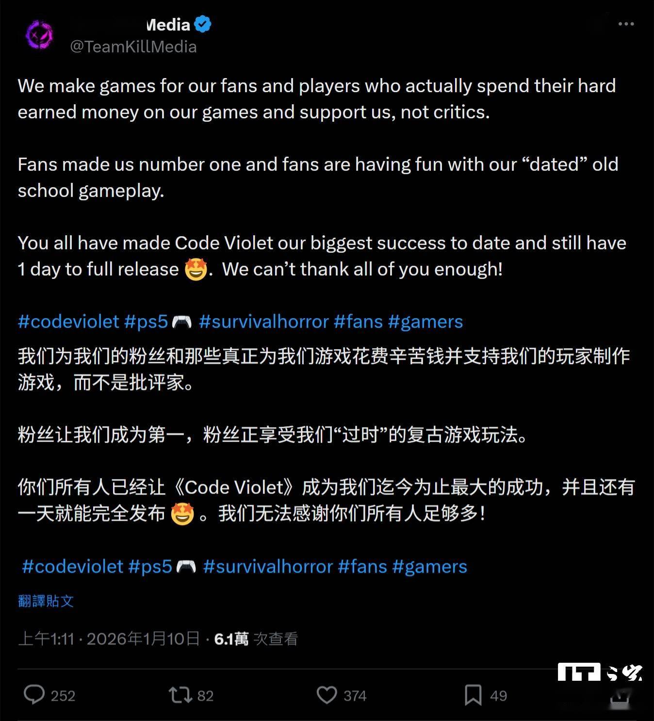 然而这款游戏的开发商 TeamKill Media 却对玩家们的批评声音充耳不闻,并于 1 月 10 日在 X 平台作出回应:“我们的游戏专为支持我们的粉丝和玩家打造,他们用辛苦赚来的钱购买游戏并支持我们,但我们的游戏并不是为批评家而设”。