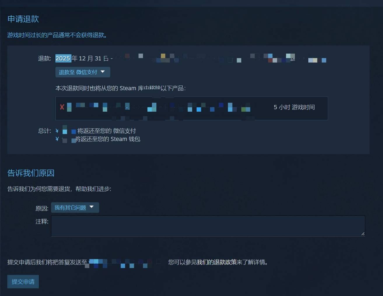 对比之下,PC 平台的 Steam 商店退款政策较为宽松,允许玩家在购买后 14 天内、游玩时间小于 2 小时的情况下申请无条件退款。