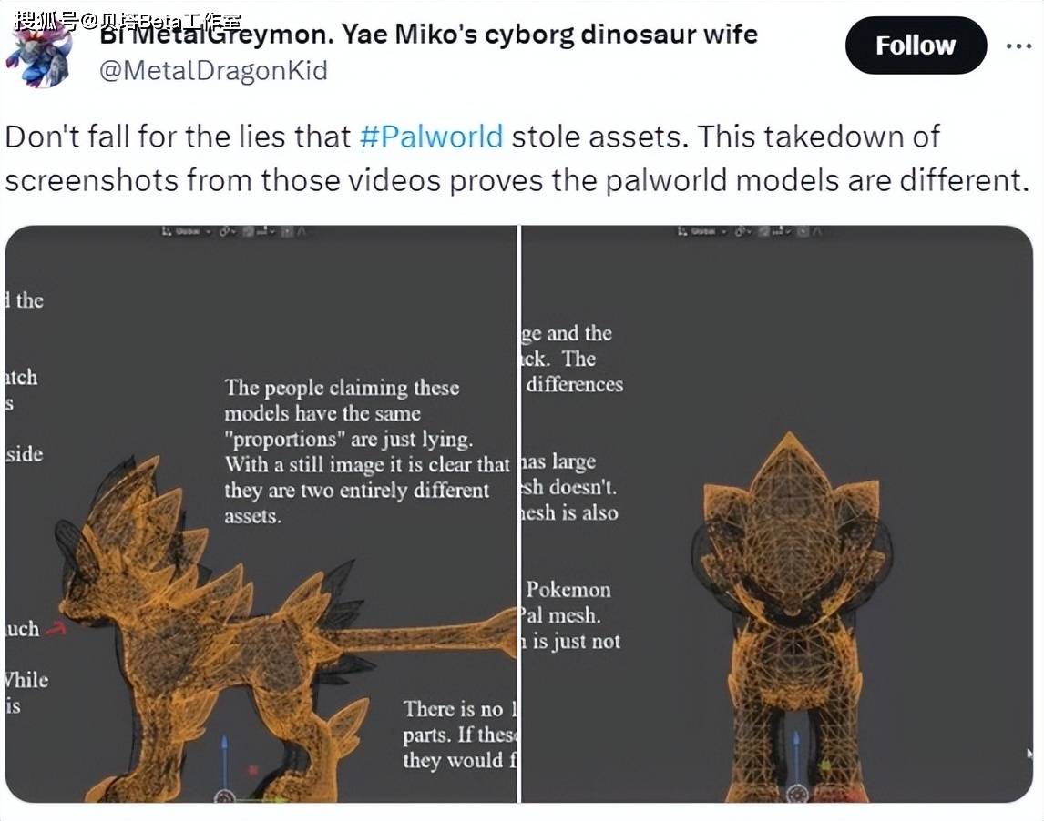 虽然没有点名说是《幻兽帕鲁》,但是从最近游戏的火爆程度以及话题度来说,大家都知道说的就是《幻兽帕鲁》。在海外社交平台,有非常多的网友、媒体人都在讨论《幻兽帕鲁》是否侵权宝可梦的话题,甚至有人把两款游戏的模型进行对比,有网友认为模型非常相似,涉嫌抄袭,也有人表示说抄袭是因为把模型进行了调整,实际上幻兽帕鲁和宝可梦的模型完全不一致,外网也吵翻天了。