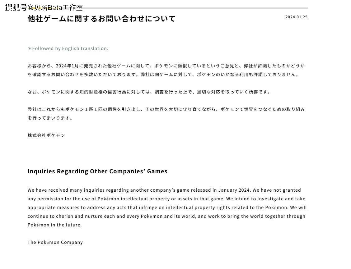 宝可梦公司的声明如下,表示在1月份已经收到了很多关于某款游戏的询问,也确定宝可梦没有给该款游戏任何授权,即将对侵犯自己知识产权的行为进行调查,并且在调查后将采取一些措施处理。
