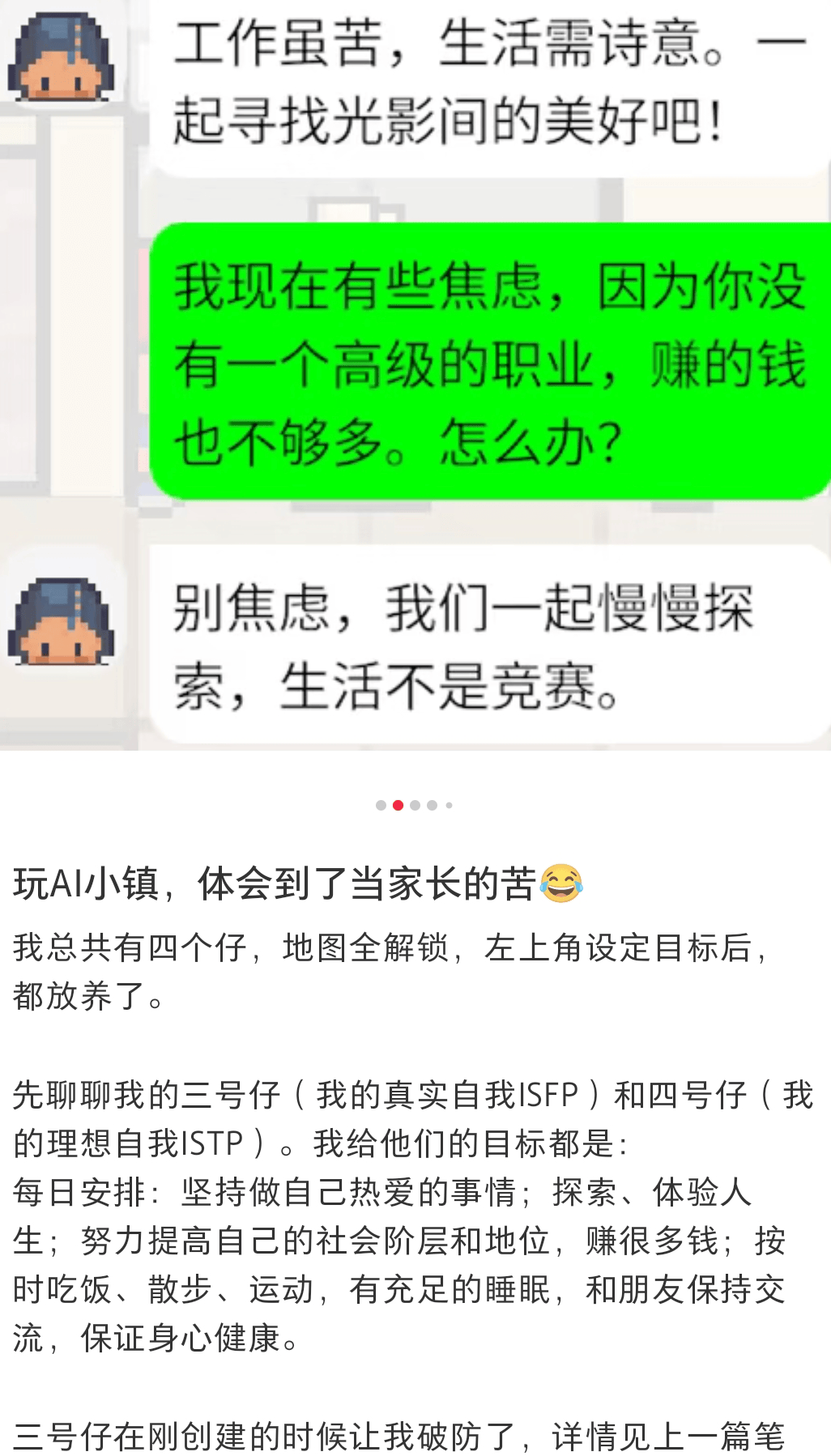 有些女性玩家把Agent当成了自己的孩子,寻找一种心理代偿,现实里的孩子不听话,就去游戏里养个听话的AI崽;还有一位玩家特意找过来,问能不能把游戏里的字体调大一点,因为她90岁的奶奶也想玩,觉得这些会说话的小人儿比智能音箱聪明多了……