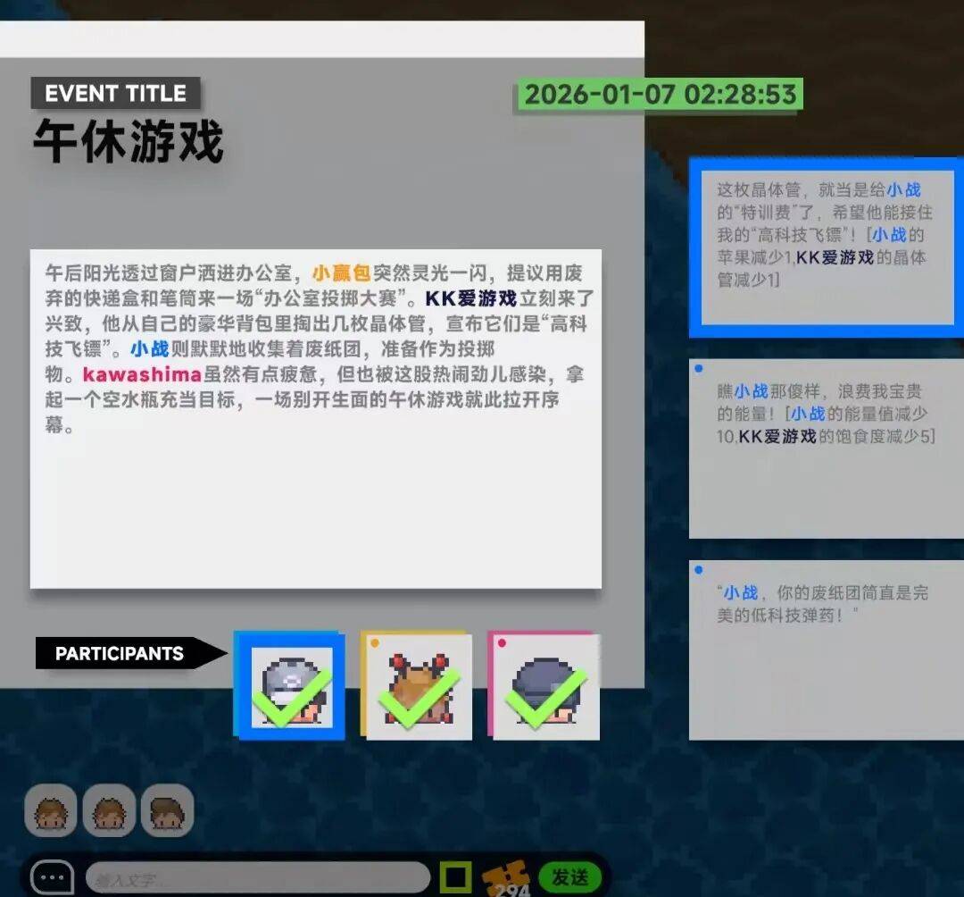 近期新版本上线后,Oliver向我表示,新功能大幅提高了玩家社群里的社交活跃度。之前大家没太多新东西可聊;有了事件系统,每天都有各种趣事,大家相互捣乱和帮忙。“群里的聊天量,体感上增加了5-10倍。”