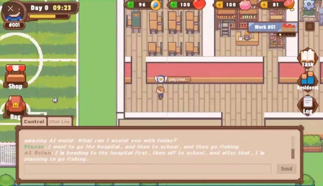第一版,团队完全照着“斯坦福小镇”的论文做复现。那是纯学术的思路,让AI一步步推导状态。但上手后发现这套框架对游戏来说太简陋了,AI只能走路和说话,完全对齐不了游戏里该有的数值、属性,根本没法玩。