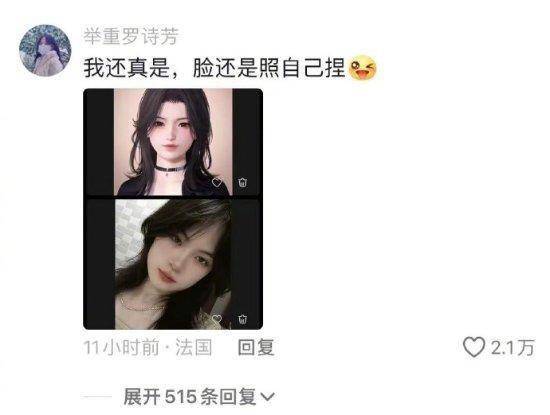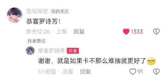 8月9日,罗诗芳在社交平台分享了一段自己获得冠军的视频,3D恋爱手游《恋与深空》官方在评论区里对罗诗芳表达了祝贺,罗诗芳也回应道:“谢谢,就是如果卡不那么难抽就更好了。”除此之外,罗诗芳还发布了一张照片,表示脸都是按照自己样子捏的。