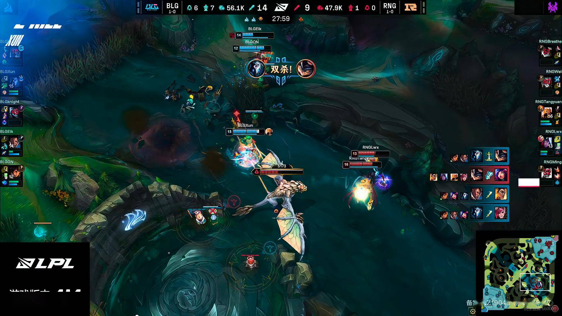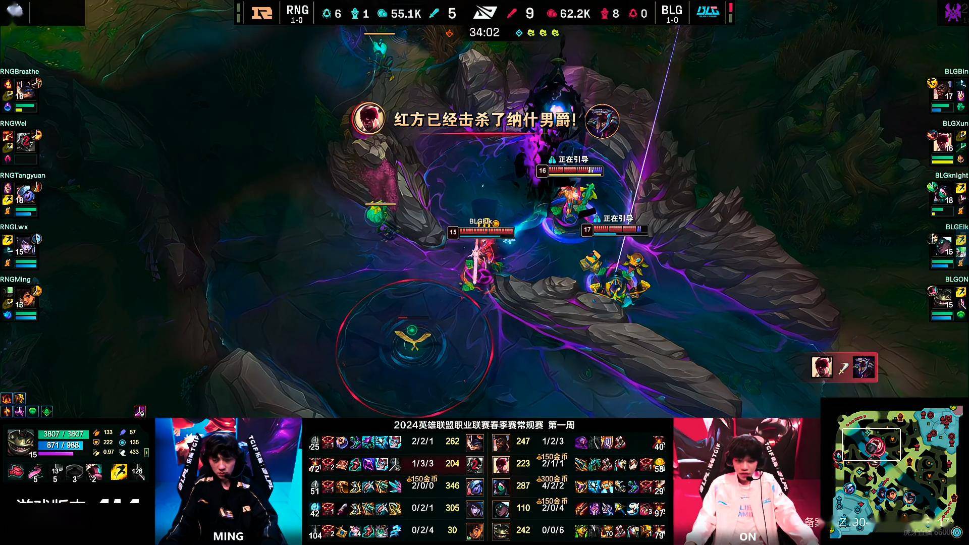 比赛24分钟BLG推掉RNG的中路二塔后,直接去rush掉大龙,Elk卢锡安与妮蔻两人瞬秒清视野的Wei蔚。BLG拿下大龙后又拿到风龙魂,虽然RNG抓住一次Elk卢锡安的失误,将BLG五人击杀,但BLG整体还是优于RNG,打到31分钟,BLG也是带着大优势,平推了RNG基地拿下第一局比赛胜利。