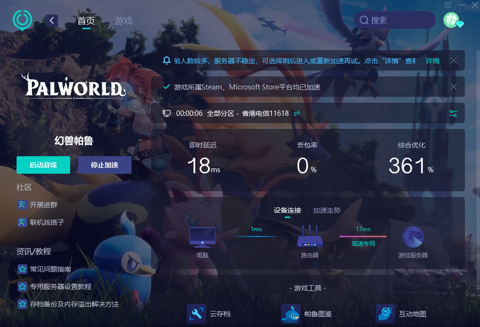 二:点击优化即可获得稳定网络连接,畅玩幻兽帕鲁,最多人用的加速器,全网主播都在用,效果有保障
