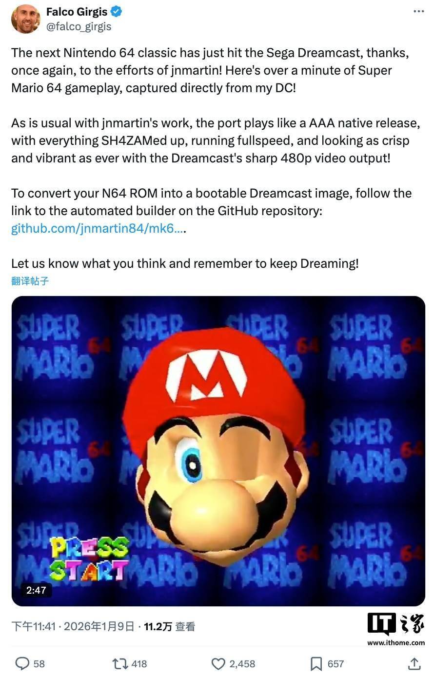 IT之家 1 月 13 日消息,据外媒 NotebookCheck 报道,开发者 MrNeo、Falco Girgis 和 jnmartin84 合作将任天堂经典 N64 游戏《超级马力欧 64》移植到了世嘉 DreamCast 主机上。