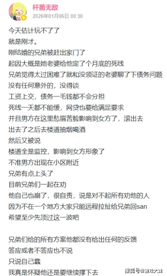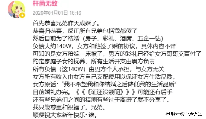 小明剑魔被好友爆料,为了结婚负债140W,老婆拿彩礼给哥哥买房子,近几年,关于男女情感与婚姻的话题频频登上舆论风口,而“付出是否对等”几乎成了所有争议的核心,爱情本该是两个人共同奔赴的过程,可一旦被明码标价,感情就很容易变成一场单方面消耗,最近,B站一位知名UP主分享的朋友经历,正好戳中了无数网友的情绪神经。