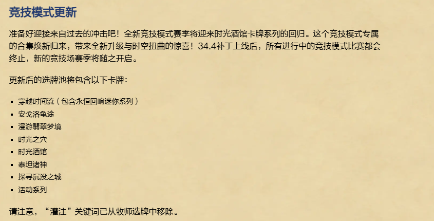 同时,竞技模式的全新赛季也会一同开启,不仅对选牌池进行轮换,还将“灌注”从牧师选牌里移除,具体的卡池如下: