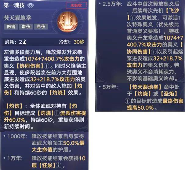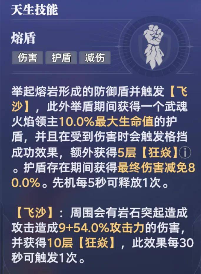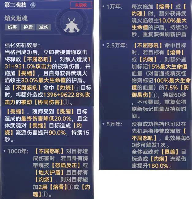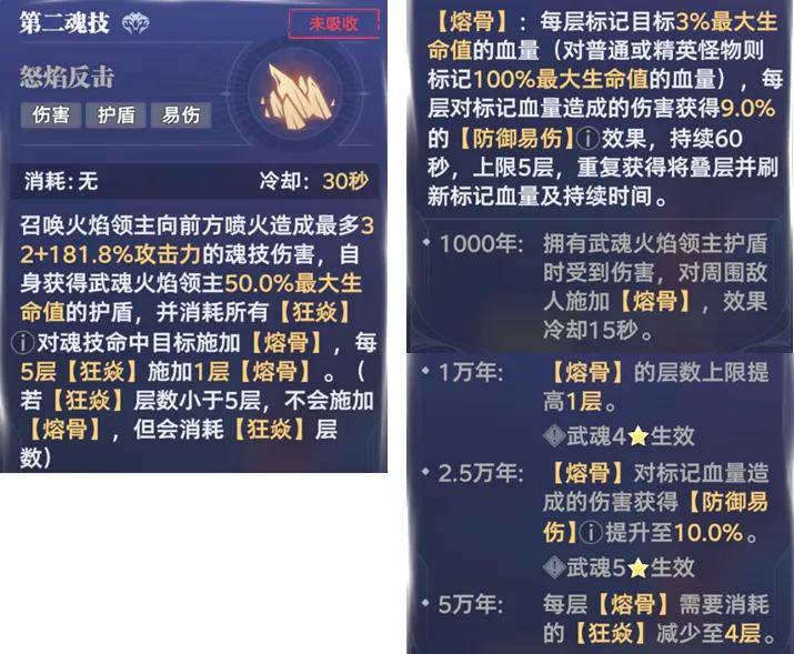 接着焱的2魂技也稍微说下,那么这个魂技最为主要的功能就是通过消耗狂焱来施加防御易伤,同时还能为自身施加护盾,但综合焱所有的防御易伤能力来讲,其对比目前的几位主流防控增伤角色并无什么优势。