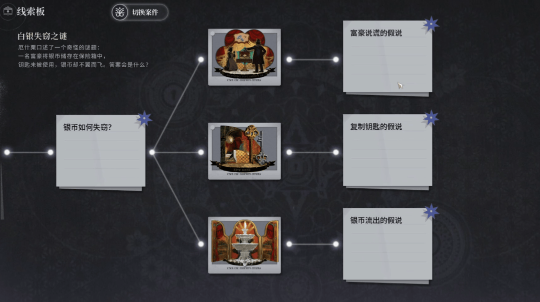 游戏给每一个案件都设计了块线索板,将案情逻辑可视化:板子上罗列着各种碎片线索,以及它们的因果关系,指引玩家推导出最终的真相。任务的不同阶段也借此划分,玩家需要不断通过不同方式去搜集线索,来拼凑出真相。