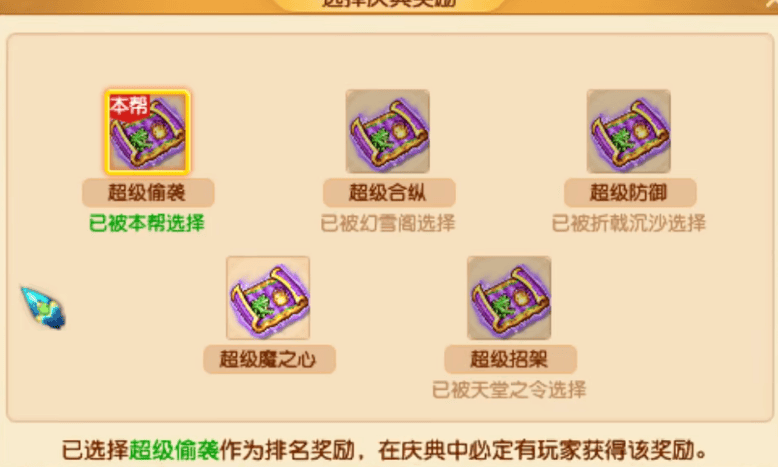其余四本超级兽诀的选择情况分别为:【折戟沉沙】选择了超级防御、【天堂之令】选择了超级招架、【天天开心】选择了超级偷袭、【天龙会】则选择了超级魔之心。