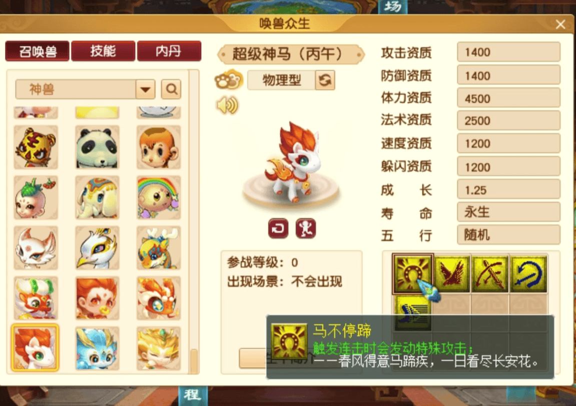 2026马年生肖神兽“超级神马(丙午)”已曝光真容。根据召唤兽图鉴信息,若选择物理形态,它将拥有专属技能“马不停蹄”。该技能为物理攻击专属,仅在触发连击时发动。
