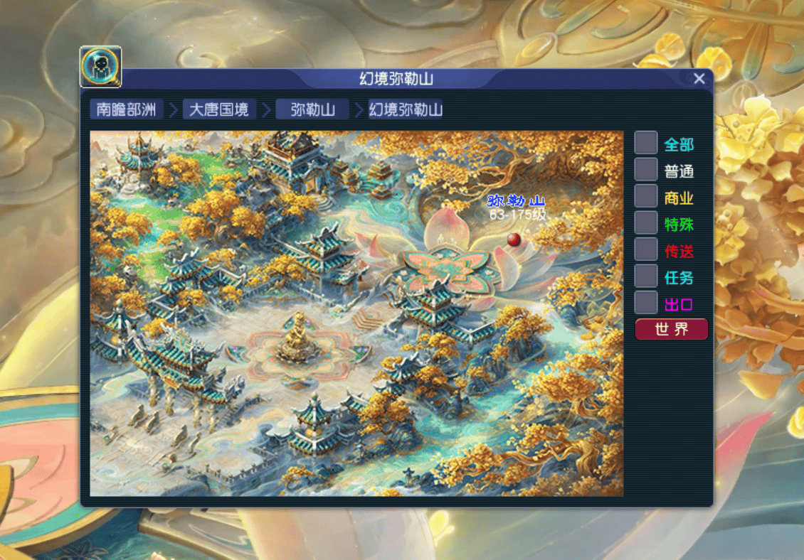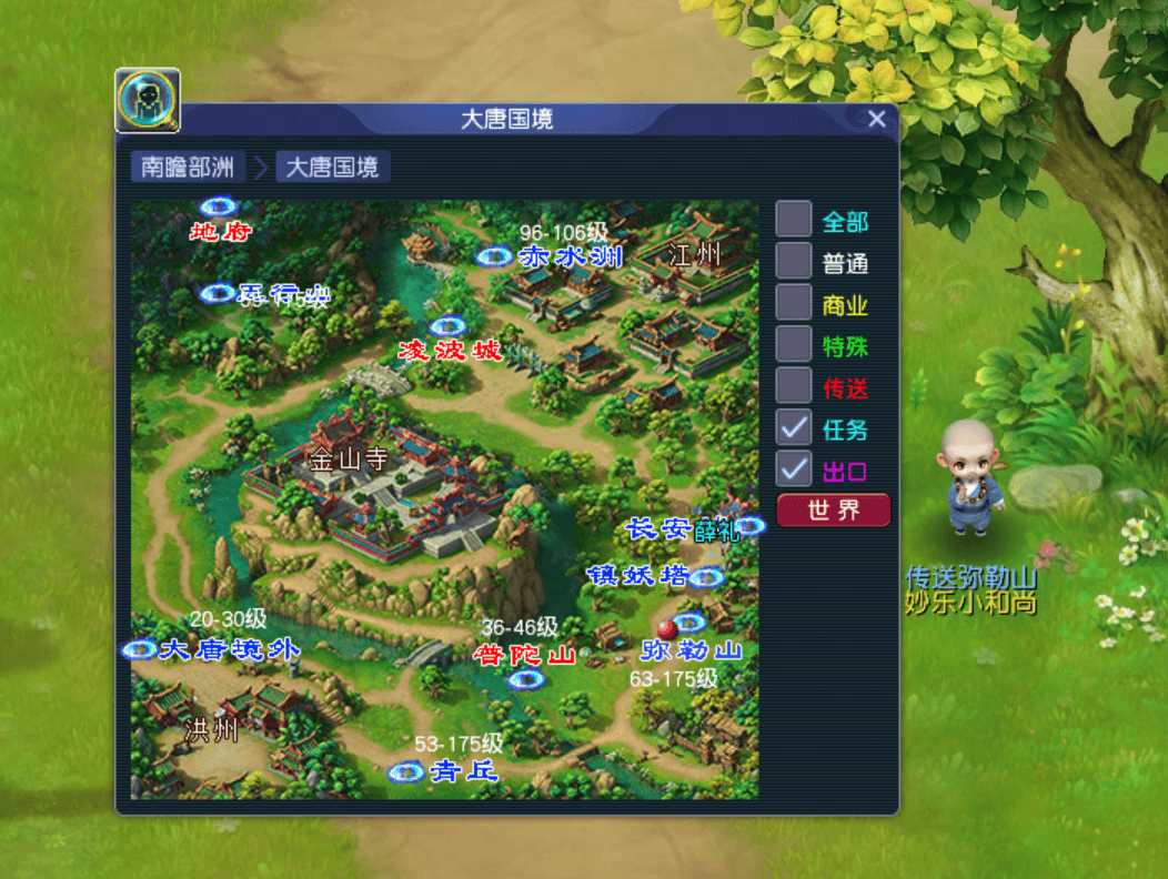 玩家可通过长安城南城门(11.33)传送到大唐国境,在场景内找到妙乐小和尚(311,93),由其接引至弥勒山。