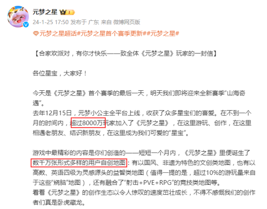近日,《元梦之星》的主创团队发布了一封公开信,向全体玩家介绍了游戏的上线成绩、后续规划和开发理念。从这封信中,我们可以看到《元梦之星》不仅是一款游戏,更是一个集成了多种线上社交娱乐方式的“小小元宇宙”,它的目标是打造一个全新的世界和平台,让每个人都能携手亲朋好友、网络玩伴一起“向快乐出发”。