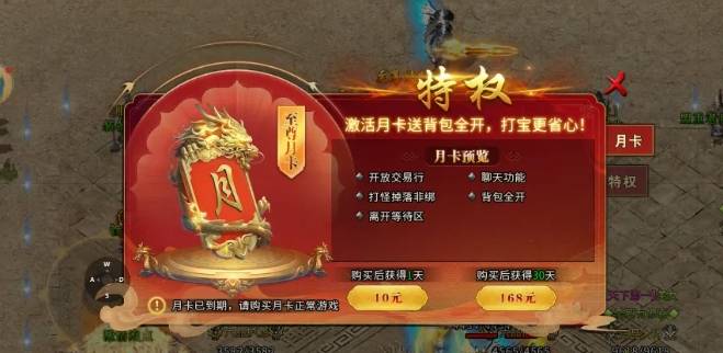 购买左上角168月卡,出现特权界面后直接购买98特权,最后去盟重商城购买28的治疗宝珠,一共168+98+28=294,平均10块每天