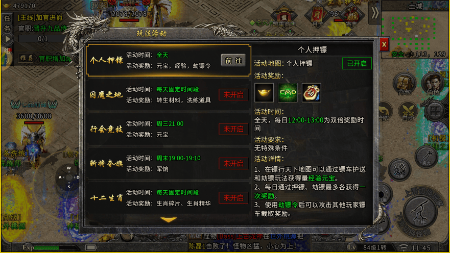 然后到大厅找到“盟重老板”去进行押镖活动。第一天押镖没有双倍的奖励。押镖介绍活动点开的时候有介绍,押镖结束后,找到狂暴之力直接开启狂暴,一切准备号就可以直接下图。土城右边的图都是简单的地图,随便哪个图,先转生材料1-3和9品官职证明打好就行,先不管能打出多少元宝,前期只要是绿色箭头的装备直接双击穿到身上就行。