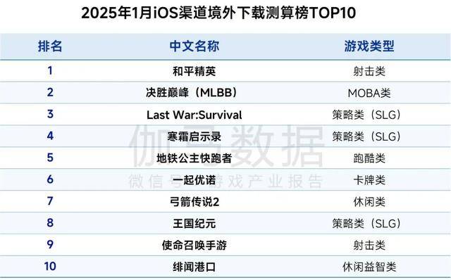 2025年1月iOS渠道境外下载测算榜TOP10中,三款策略类(SLG)产品入榜,《Last War:Survival》《寒霜启示录》《王国纪元》上线均超1年,仍能保持较佳市场表现,部分产品得益于玩法融合、副玩法买量等运营方式。