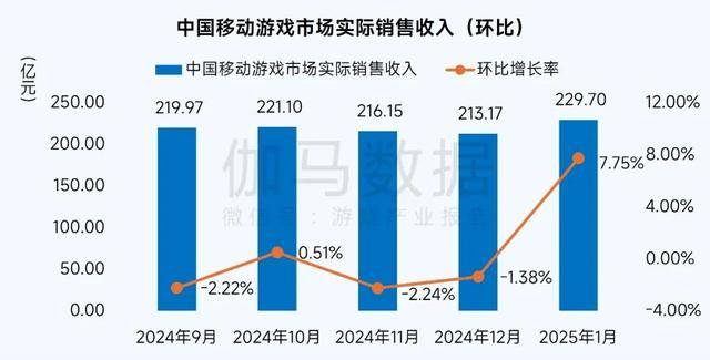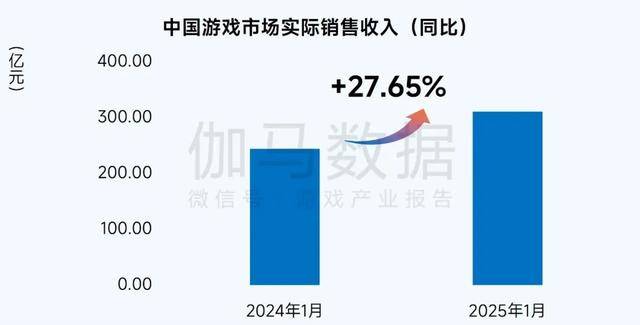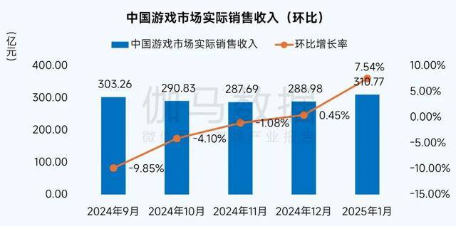2025年1月,中国游戏市场实际销售收入310.77亿元,环比增长7.54%,同比增长27.65%。受春节假期用户活跃度高、新品表现佳等因素带动。