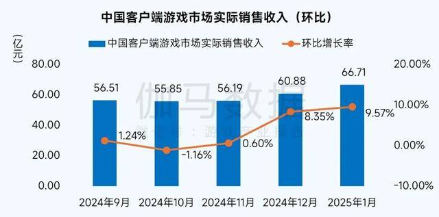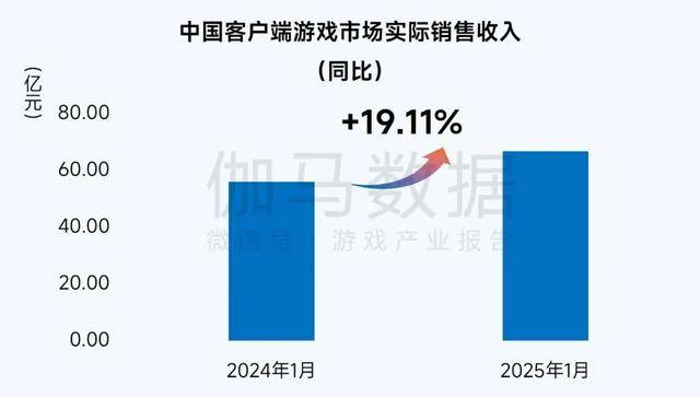 2025年1月,中国客户端游戏市场实际销售收入达66.71亿元,环比增长9.57%,同比增长19.11%。
