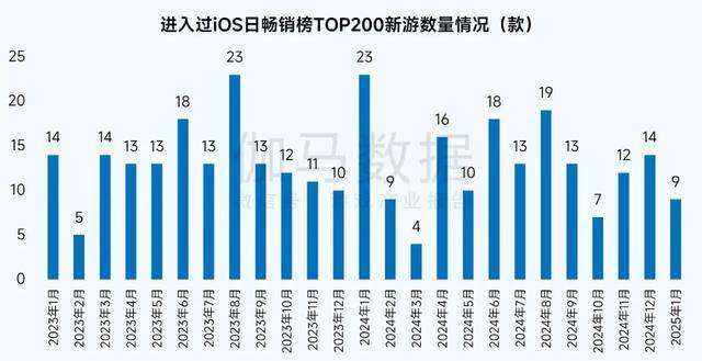 2025年1月,进入过iOS日畅销榜TOP200的新游数量为9款,环比同比均下降。