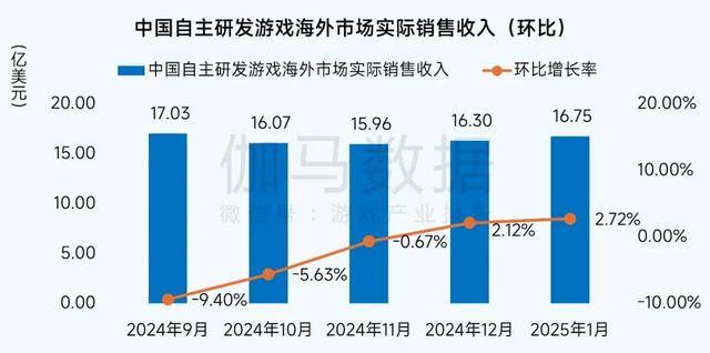 2025年1月,中国自主研发游戏海外市场实际销售收入为16.75亿美元,环比增长2.72%,同比增长28.65%。