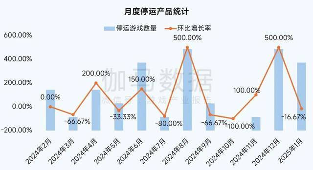 2025年1月,多款移动游戏停运,停运产品数量环比下降16.67%。