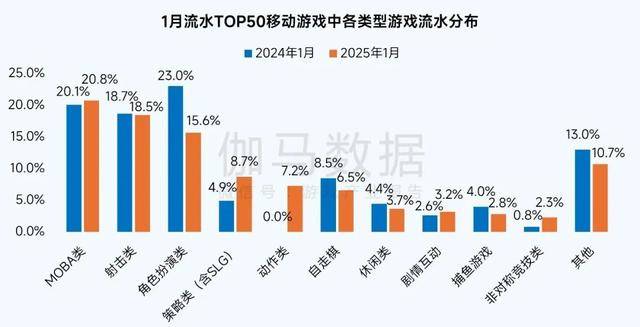 2025年1月,流水TOP50移动游戏中,位于TOP3的MOBA类、射击类、角色扮演类移动游戏流水份额均同比下降,策略类(含SLG)、动作类等类型流水份额同比增长。