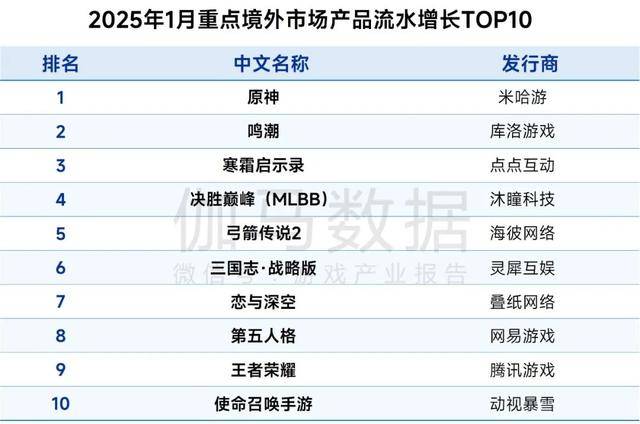 2025年1月重点境外市场产品流水增长TOP10中,《原神》登顶,《原神》的流水增长得益于其5.3版本“炽烈的还魂诗”的推出和全新角色“玛薇卡”“茜特菈莉”的登场。