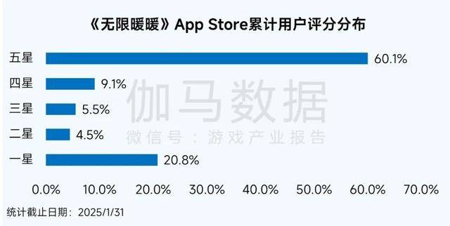 统计日期内,《无限暖暖》在App Store中获得五星评分超60%。从评价内容来看,给出较高评分的玩家认为角色形象、服装等内容较符合预期,并对世界探索玩法表示认可;给出较低评分的玩家表示移动端画质较低,并且出现闪退等情况,建议企业进行持续优化。