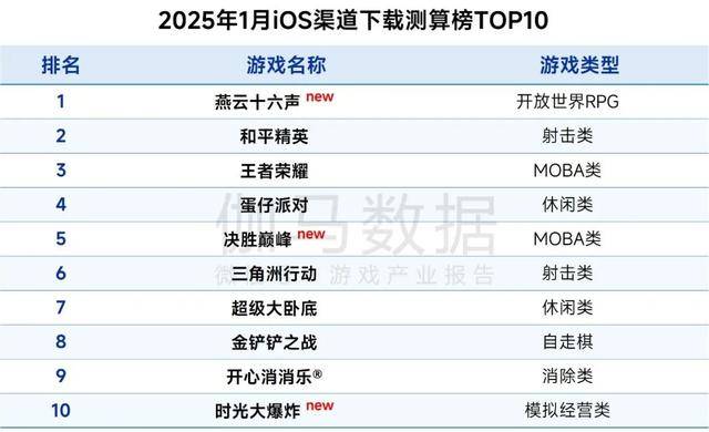 2025年1月iOS渠道下载测算榜TOP10中,《燕云十六声》登顶,此外,新游《决胜巅峰》《时光大爆炸》同样入榜。