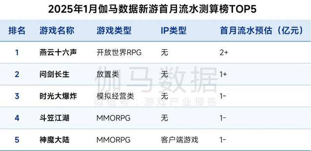 2025年1月,伽马数据新游首月流水测算榜中,《燕云十六声》登顶榜单,游戏采用武侠题材和开放世界玩法,首月流水预估超2亿元,本月最高进入iOS游戏畅销榜TOP10。