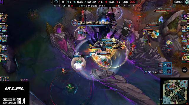 开局TT下路越塔将MISSING奥恩击杀,随后TT下路彻底解放,直接将JDG下路给“军训”。JDG打野想要帮助下路,也只是“白给”,整个前期TT依靠着下路优势拿到领先,而JDG只能依靠中上两条线。
